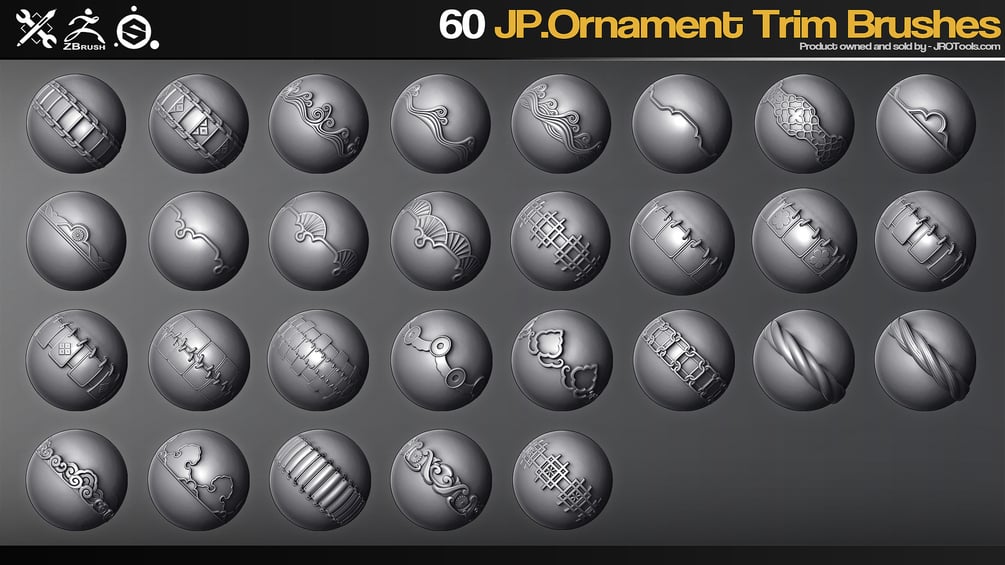 A set of 61 Japanese themed trim brushes, meant for use in ZBrush and hopefully also for Substance Painter in the future.