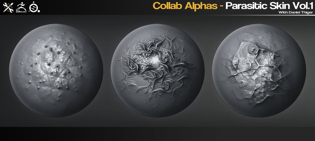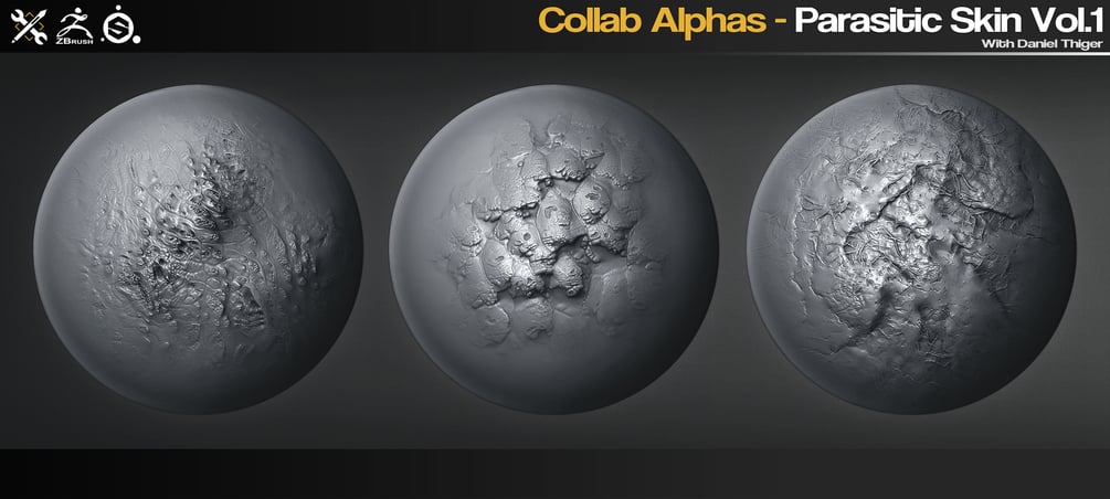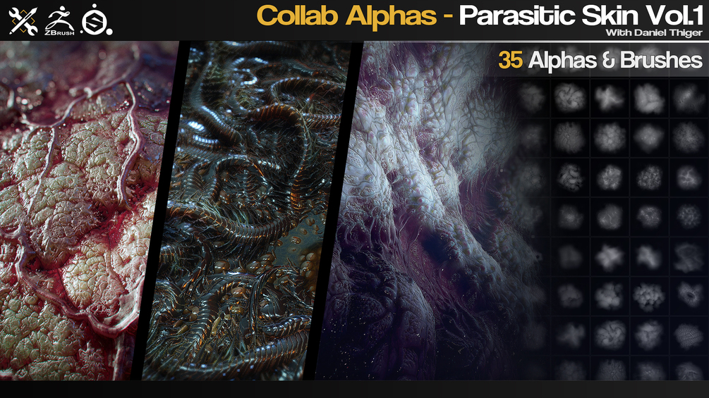 This is a set of 35 Parasitic Skin alphas/brushes for ZBrush, Substance Painter, Quixel Mixer, Blender etc. Generated and refined from the awesome collection of Substance Designer materials created by Daniel Thiger.