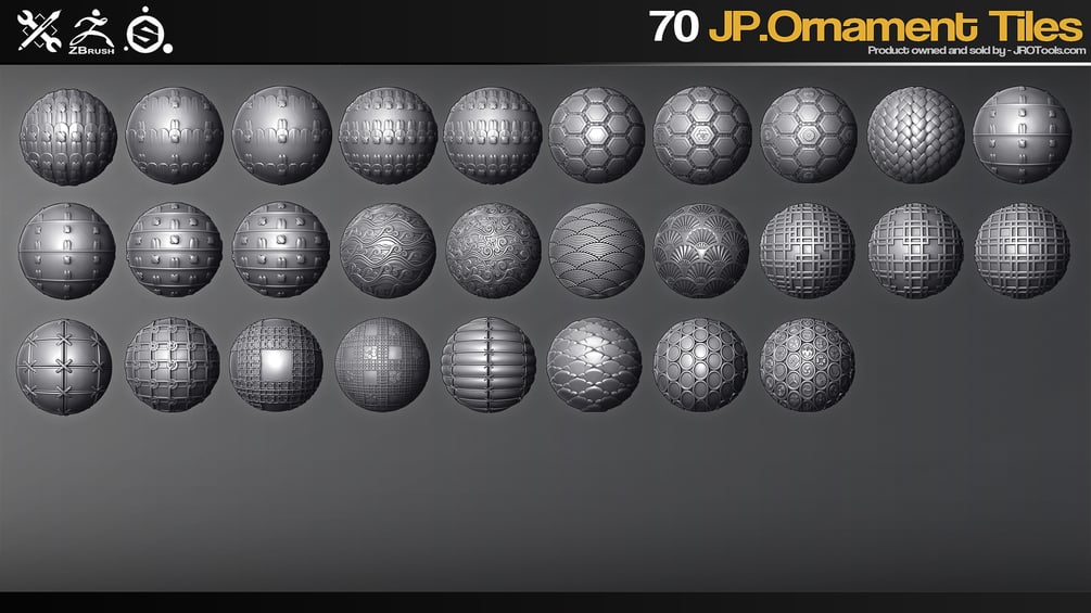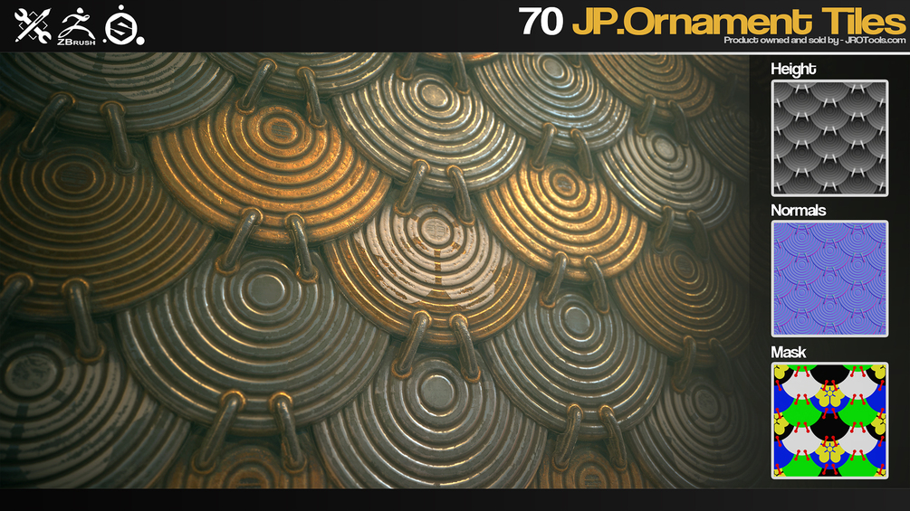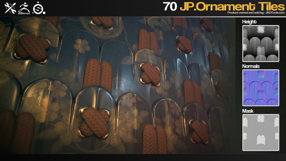 This is a set of 78 Japanese Ornament Tiles for ZBrush, Substance Painter, Quixel DDO, Mixer, NDO or any other software that allows the use of normal or height files. Tutorials on how to use tiles in ZBrush and Substance Painter as well as how to use masks with tiles in Substance Painter are included.