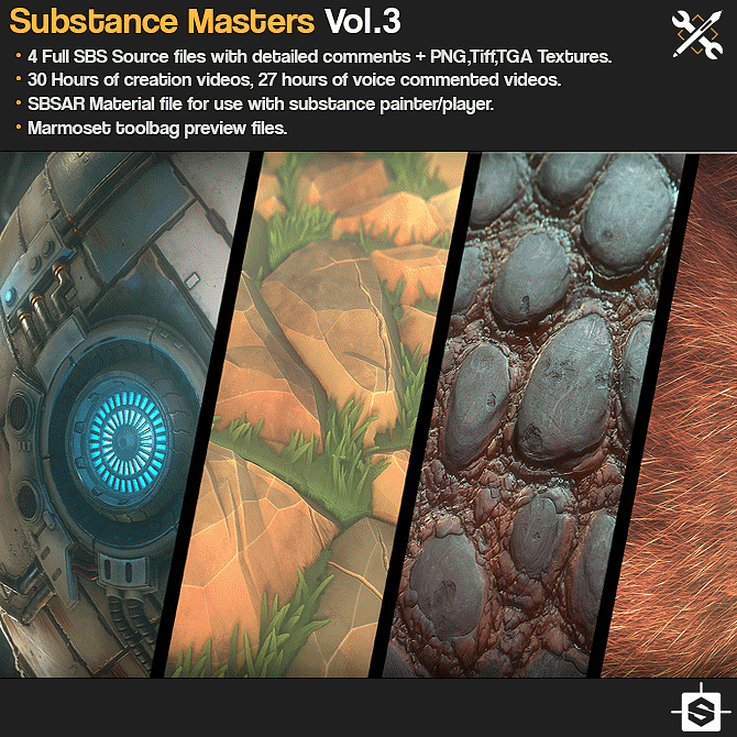 This set focuses on teaching and showing the creation process of 4 advanced substance designer materials, you can dig into the full and commented source SBS substance designer files or you can watch the creation process in the 39 hours of recorded video, 4 hours of those are voice commented. For those interested in presentation you can check out the Marmoset toolbag files that are included.