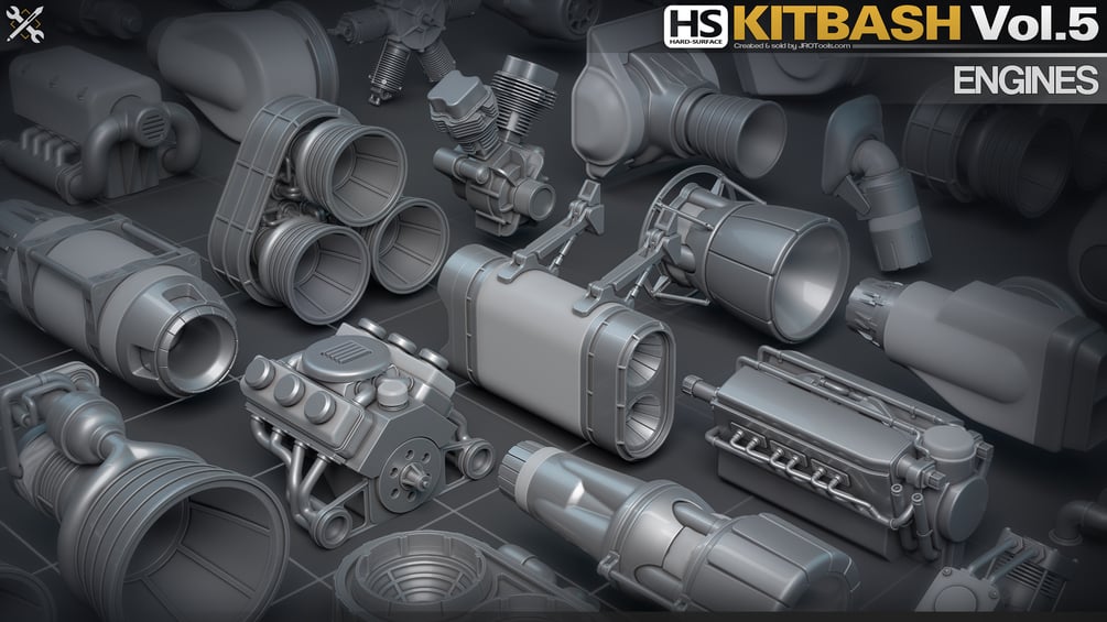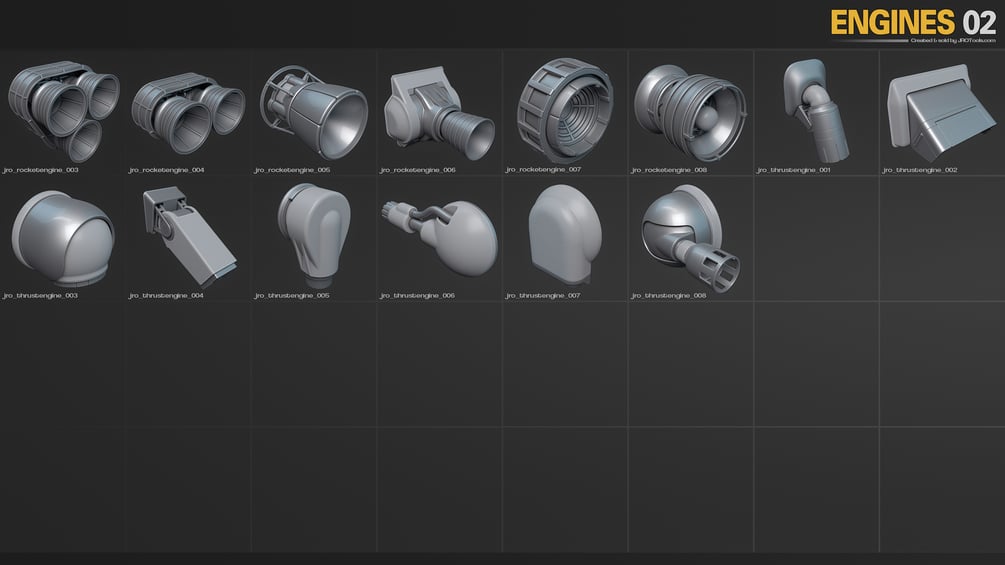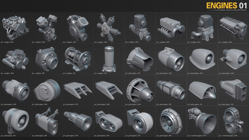 This is a set of 46 midpoly engine assets. You can use them as they are with all soft normals for real time use, or subdivide them to get a more high quality look for renders etc. The assets are uv-mapped with fully closed geometry, and are created in a way so that you can easily customize the meshes if needed.