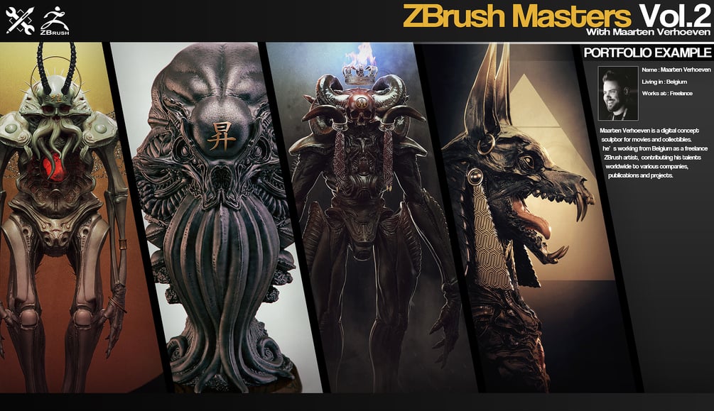 This tutorial series focuses on showing the workflows and techniques of top talent ZBrush artists. In this volume we will join Maarten Verhoeven, who has a massive portfolio of high quality Character/Monster sculpts. In his tutorial he will be sculpting his version of a Shinigami, you will get to see his sculpting process from the beginning to the end, as well as his render and presentation workflow. While he works he also shares his ideas and techniques in the commentary.