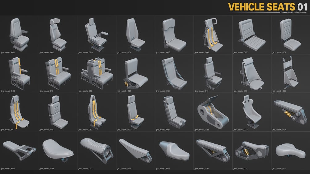 This is a set of 40 midpoly seat assets. You can use them as they are with all soft normals for real time use, or subdivide them to get a more high quality look for renders etc. The assets are uv-mapped with fully closed geometry, and are created in a way so that you can easily customize the meshes if needed.