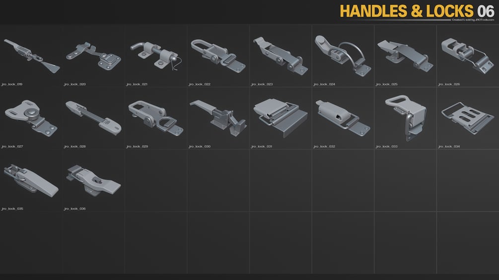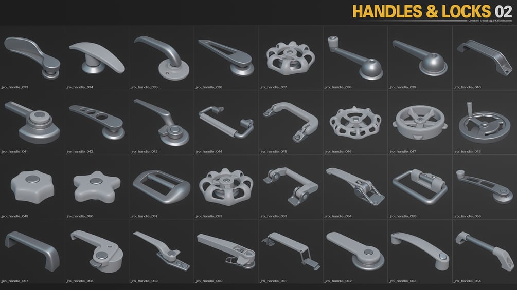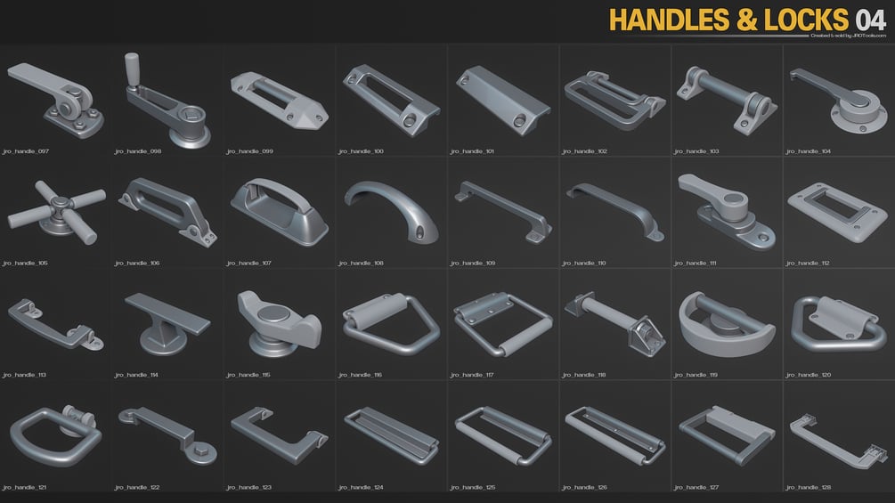 This is a set of 178 midpoly handles & locks assets. You can use them as they are with all soft normals for real time use, or subdivide them to get a more high quality look for renders etc. The assets are uv-mapped with fully closed geometry, and are created in a way so that you can easily customize the meshes if needed.