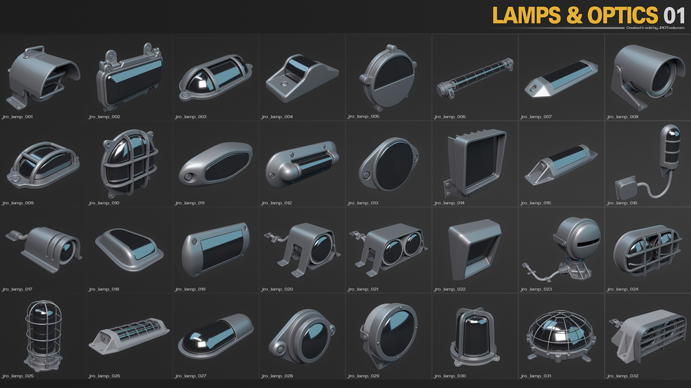This is a set of 64 midpoly lamps & optics kitbash assets. You can use them as they are with all soft normals for real time use, or subdivide them to get a more high quality look for renders etc. The assets are uv-mapped with fully closed geometry, and are created in a way so that you can easily customize the meshes if needed.