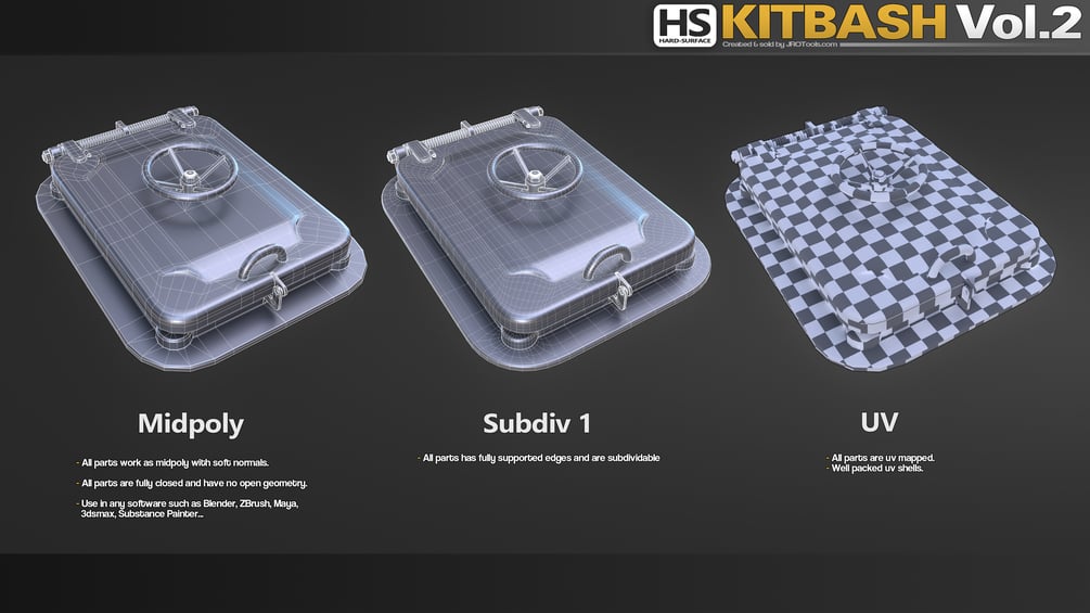 OBJ, FBX, MB files as well as IMM brushes for ZBrush are included, so you can use these assets with any popular software such as Blender, Maya, 3dsmax, Modo, ZBrush, Cinema 4D, and most other software. As the assets are pre uv-mapped you can also take them directly into texturing software such as Substance Painter and start texturing.