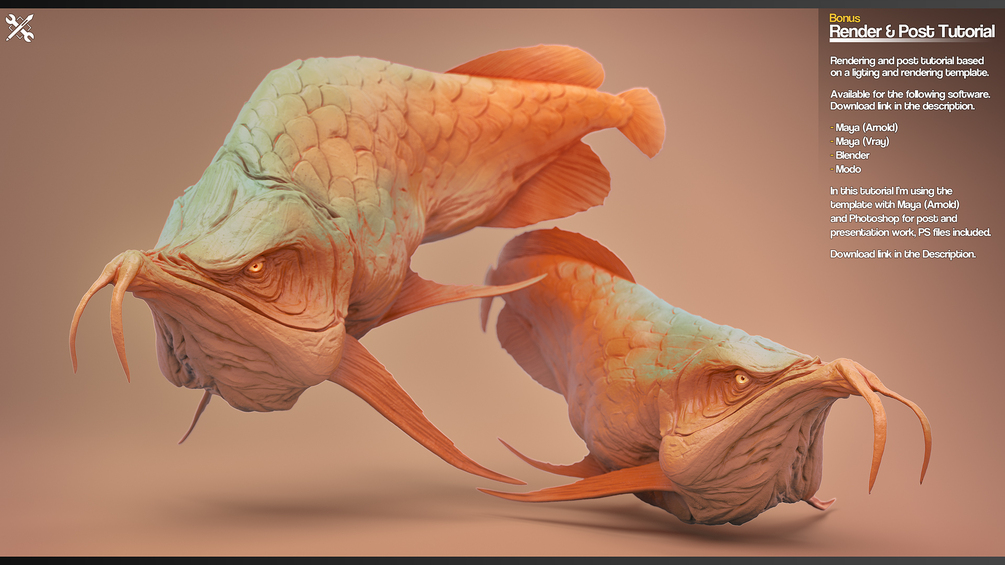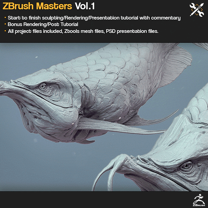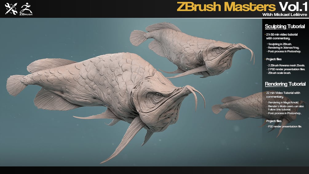 This tutorial series focuses on showing the workflows and techniques of top talent ZBrush artists. In this volume we will join Mickael Lelièvre, who has a massive portfolio of high quality creature sculpts. In his tutorial he will be sculpting an Arowana fish, you will get to see his sculpting process from the beginning to the end, as well as his render and presentation workflow. While he works he also shares his ideas and techniques in the commentary.