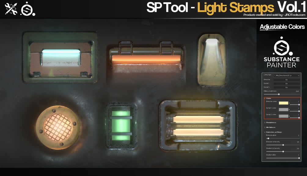 This is a Light stamp tool for Substance painter, in one click you get 2 detail masks, emissive mask and an emissive gradient mask, which are all fully customizable, change color, roughness or metallic information.