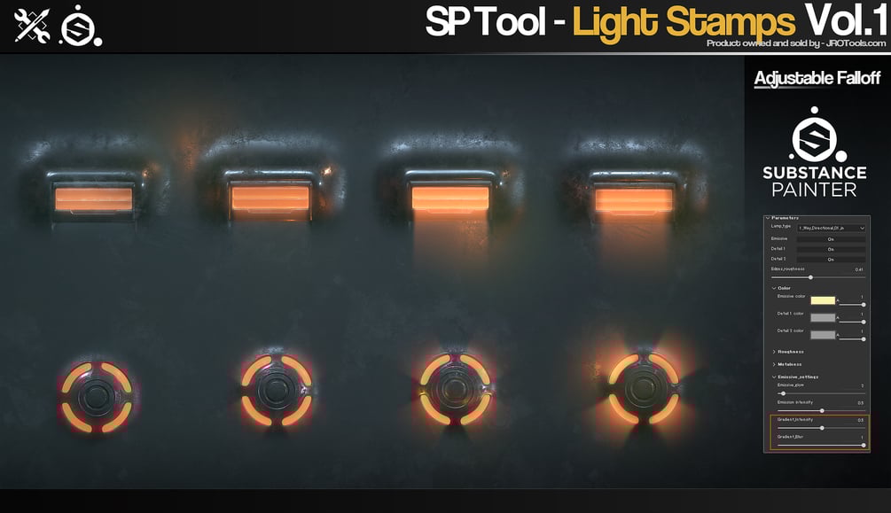 This is a Light stamp tool for Substance painter, in one click you get 2 detail masks, emissive mask and an emissive gradient mask, which are all fully customizable, change color, roughness or metallic information.