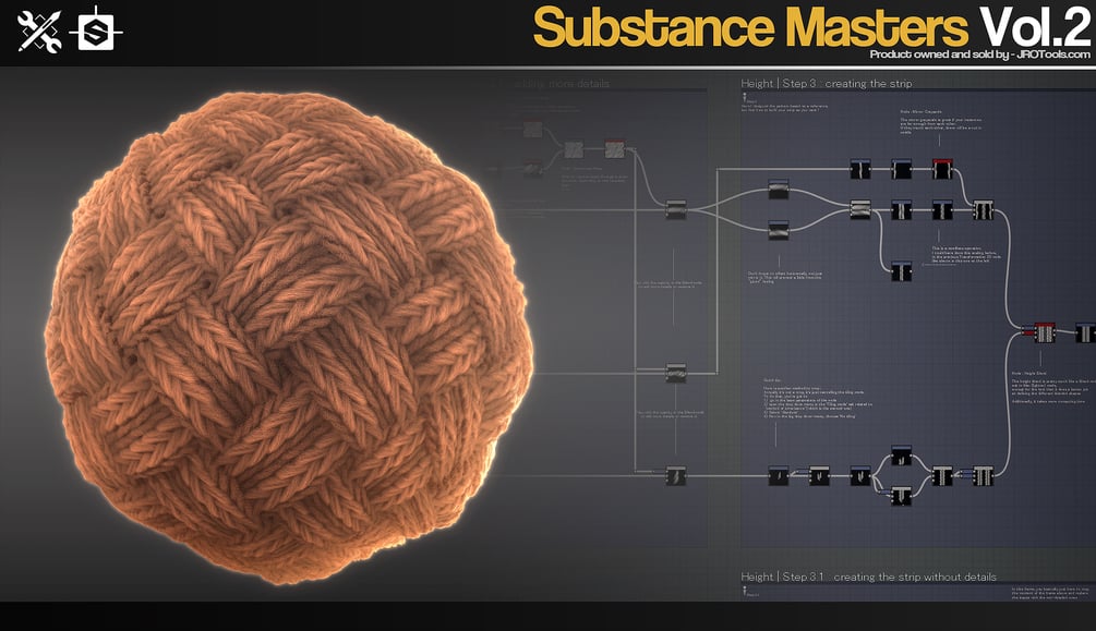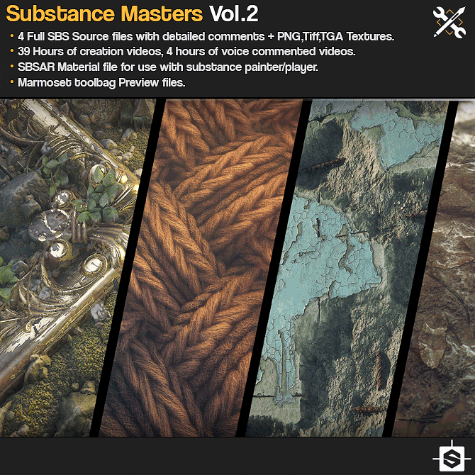This set focuses on teaching and showing the creation process of 4 advanced substance designer materials, you can dig into the full and commented source SBS substance designer files or you can watch the creation process in the 39 hours of recorded video, 4 hours of those are voice commented. For those interested in presentation you can check out the Marmoset toolbag files that are included.